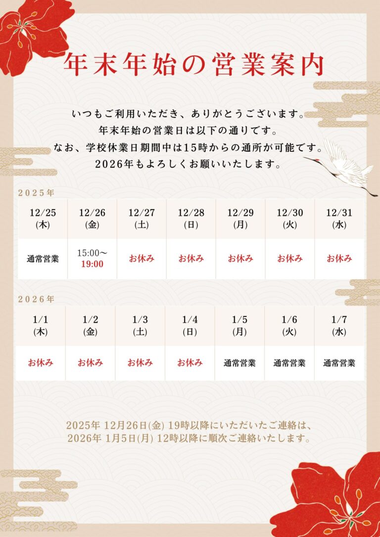 なお期間中もメールフォーム・LINEによるお問い合わせは受付けておりますが、お問い合わせのお返事は休業明け後、1月5日(月)以降、順次対応させて頂きます。