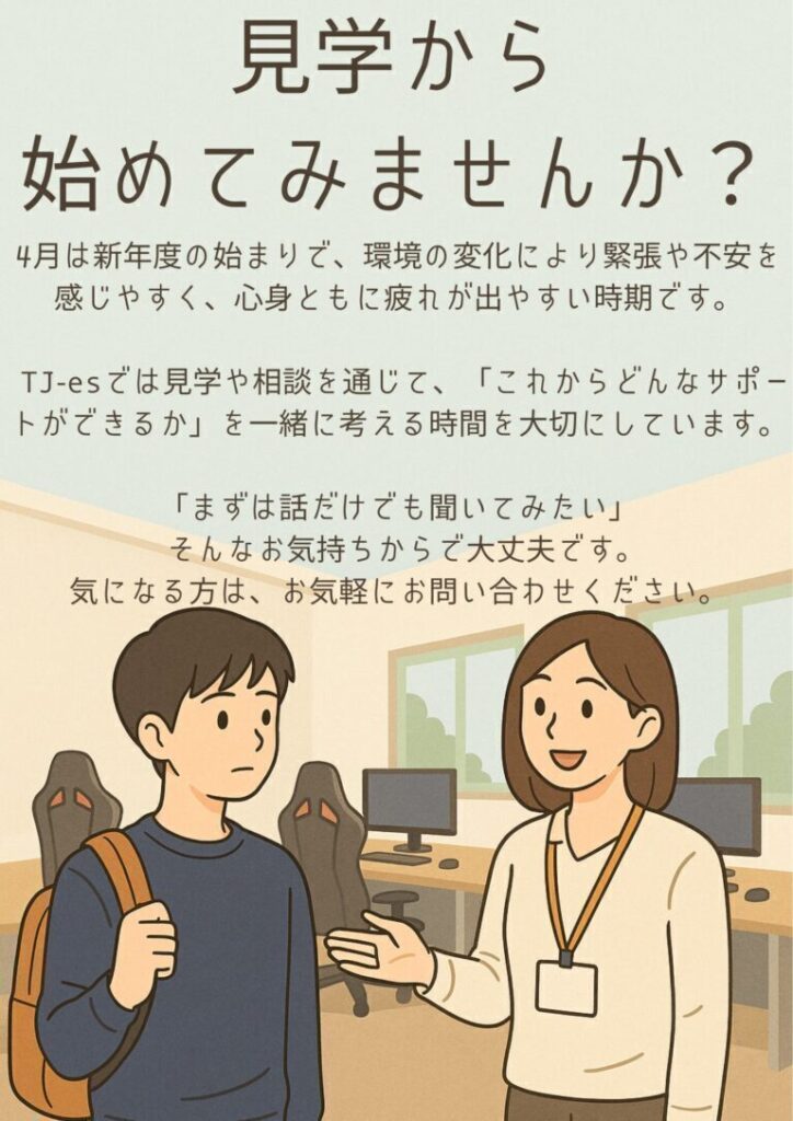 現在、札幌eスポーツ専門放課後等デイサービス「TJ-es」では、将来の就職に向けて学びたい中高生の方やその保護者のみなさま、学校やクリニックのご担当者様からの見学・利用体験・ご相談・ご質問などを随時受け付けております。